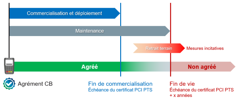 L’Agrément CB d’un Système d’Acceptation est prononcé avec une date de fin de vie. Au-delà de cette date, le Système d’Acceptation n’est plus considéré comme agréé et n’est donc plus autorisé dans le Système CB