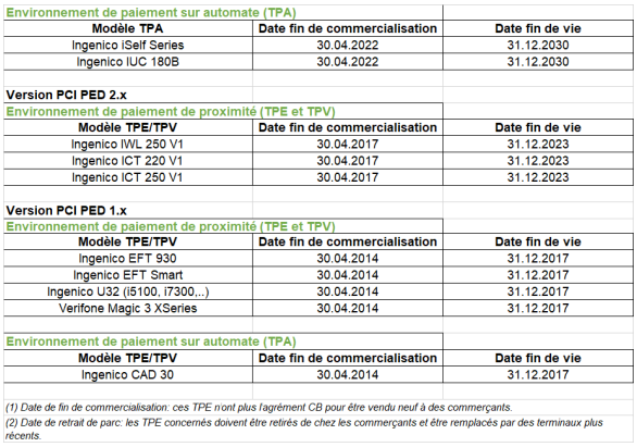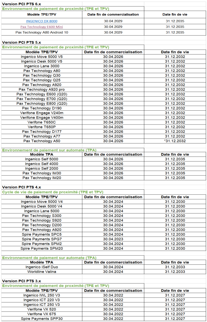 La date de fin de commercialisation et de déploiement d’un Système d’Acceptation agréé correspond à la date à laquelle le certificat PCI PTS (Payment Card Industry PIN Transaction Security) du Système d’Acceptation arrive à échéance. Elle est donc directement déterminée par la version du standard PCI PTS utilisée pour la certification sécuritaire du Système d’Acceptation.